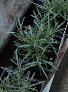 A gorgeous silvery shrub commonly called a curry plant. Grows into a compact, los mounding shrub.
